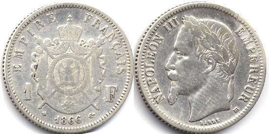 1 F. / EMPIRE FRANCAIS / 1866 / Герб с мантией и короной