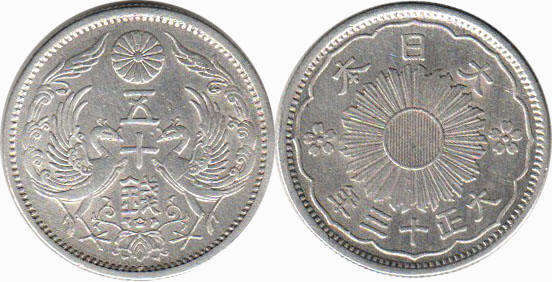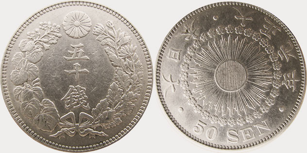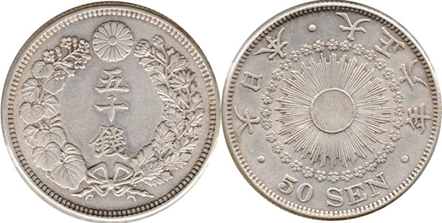 ВЕЛИКАЯ ЯПОНИЯ / 50 SEN МЭЙДЗИ 42 ГОД / солнце в круге из цветущей сакуры