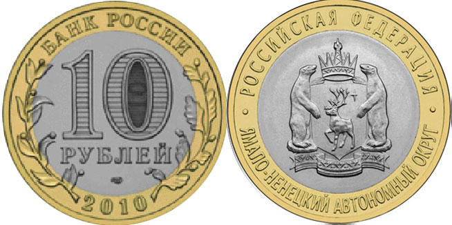 - 10 рублей 2010 Ненецкий автономный округ 1 млн. 950 тысяч экземпляров,