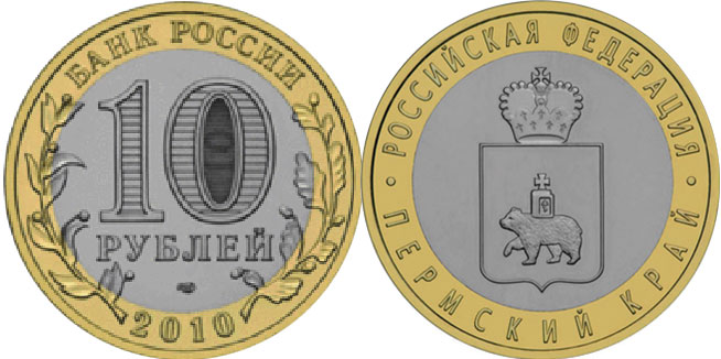 - 10 рублей 2010 Пермский край 200 тысяч экземпляров,