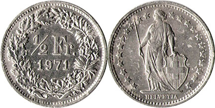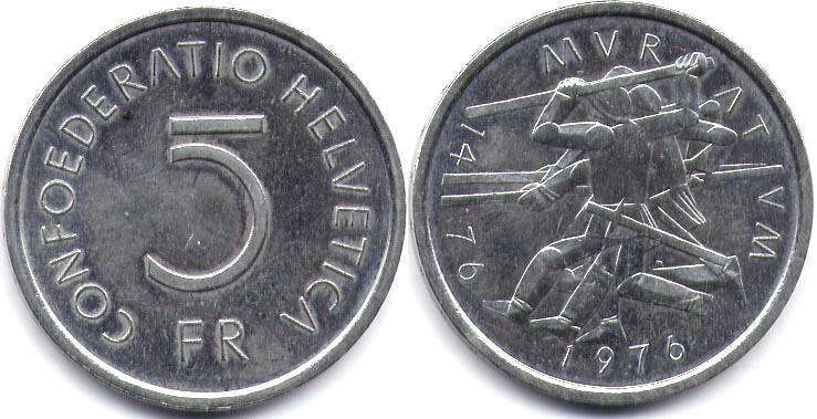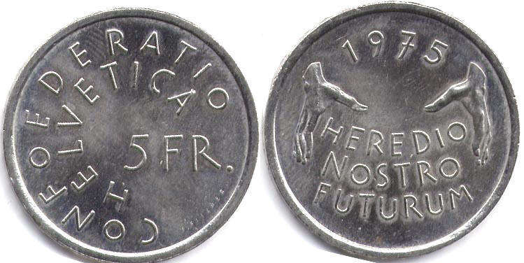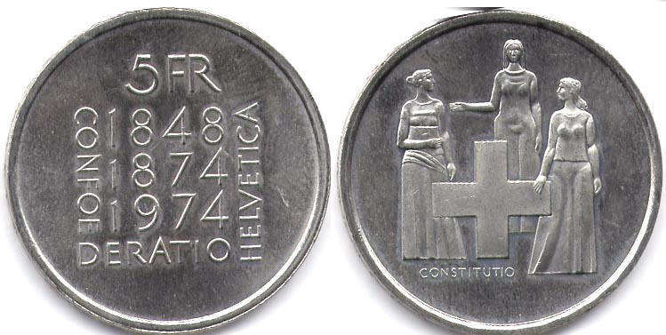 5 FR. / CONFOEDERATIO HELVETICA / 1848 1874 1974 / Даты окаймленые вертикальными надписями