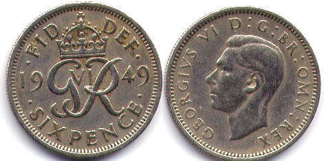SIX PENCE / FID DEF / 1949 / монограмма GR с короной